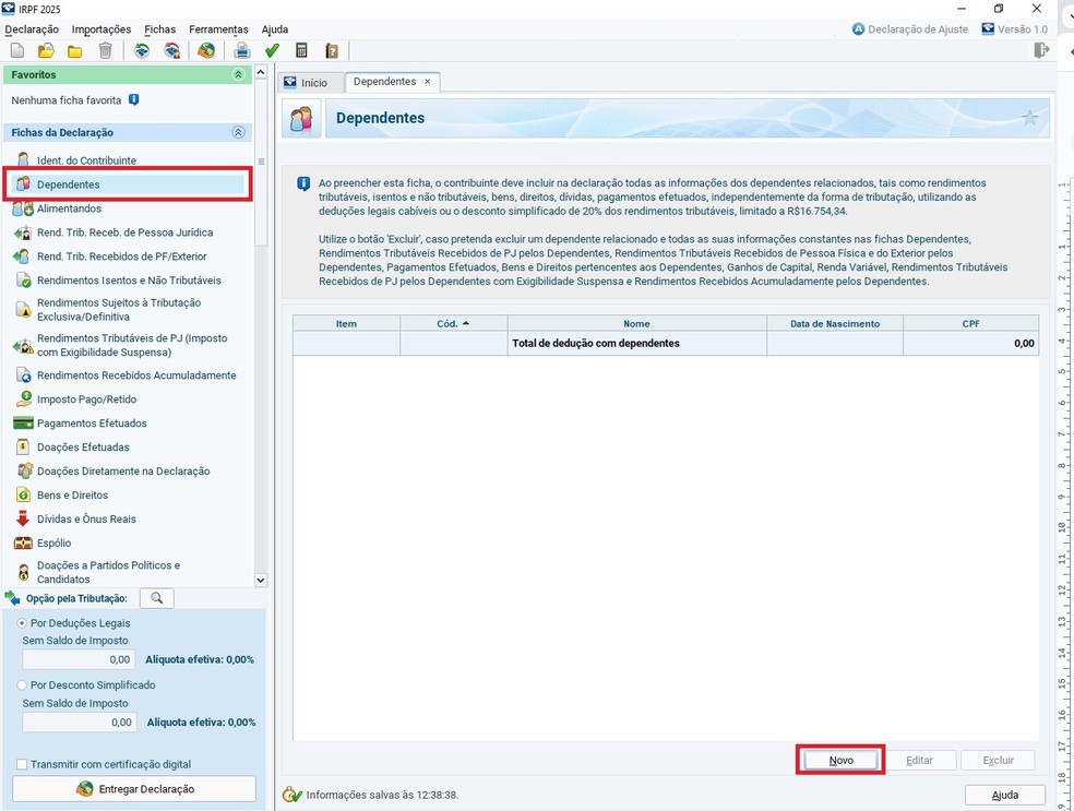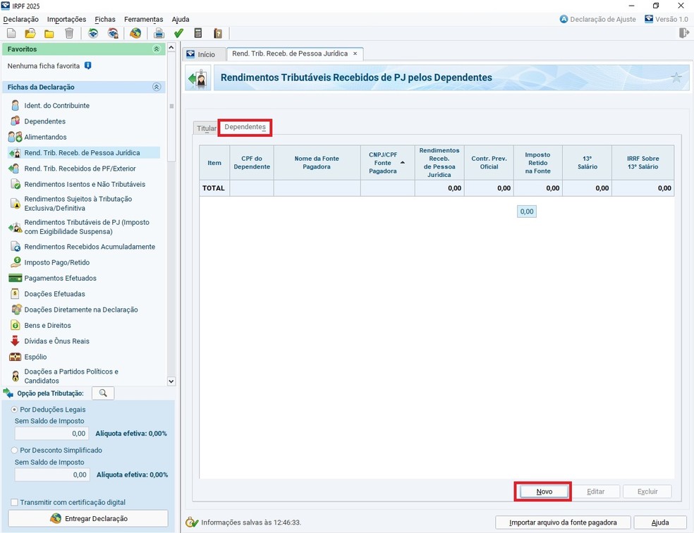 Nesta aba é preciso incluir rendimentos como salários e aposentadoria. Caso tenha mais de uma fonte pagadora,você deve preencher uma ficha diferente para cada uma,clicando em "Novo",no canto inferior direito da tela.