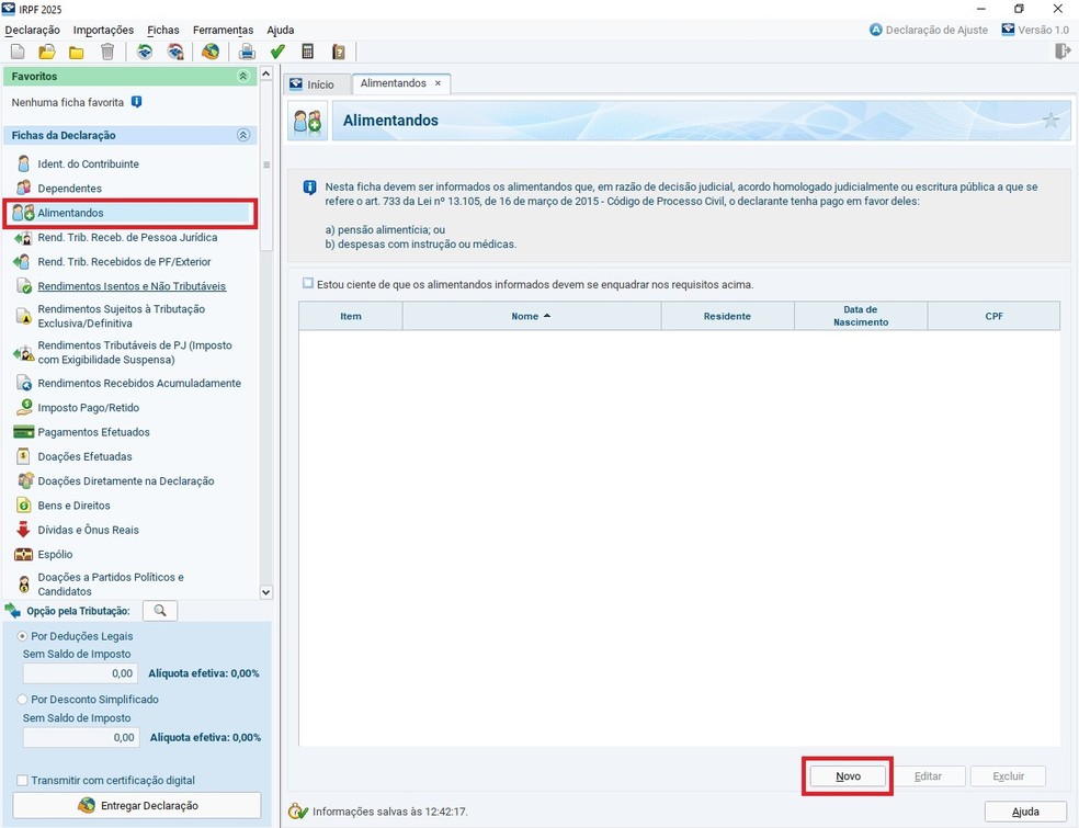 A ficha seguinte é a "Alimentandos",que diz respeito aos beneficiários de pensão alimentícia judicial ou decidida num acordo feito por escritura pública. Nesta aba,é preciso adicionar as informações do Alimentando,com o CPF do beneficiário passando a ser obrigatório.