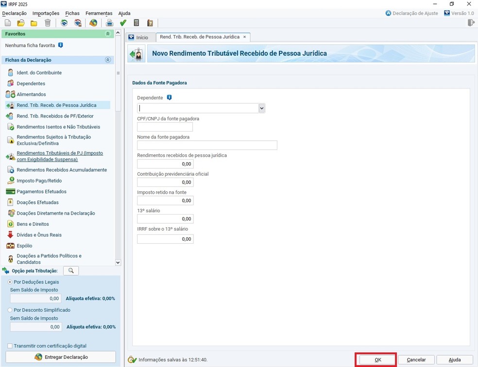 Os rendimentos de dependentes,caso existam,também precisam ser inclusos,mas na aba "Dependentes".