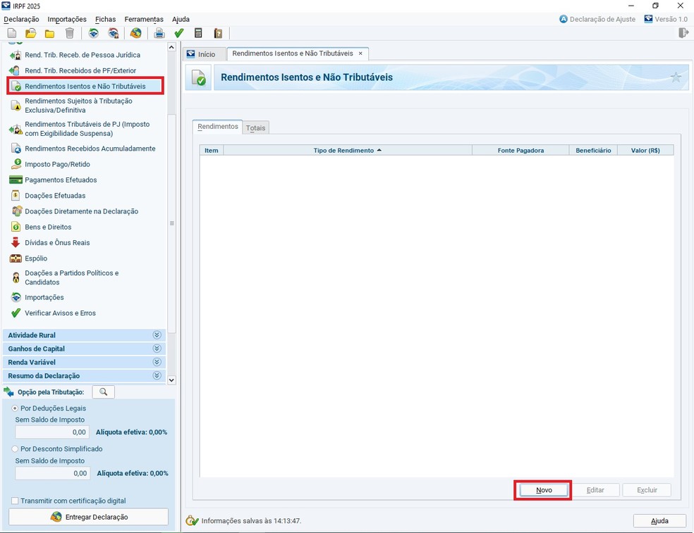 Para registrar um novo rendimento isento e não tributável,clique em novo — Foto: Reprodução