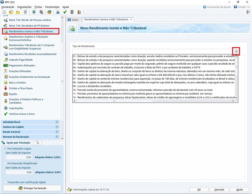 Escolha o tipo de rendimento isento que deseja prestar — Foto: Reprodução