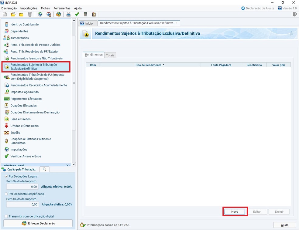 Para registrar um novo rendimentos sujeitos à tributação exclusiva ou definitiva,clique em "Novo" — Foto: Reprodução