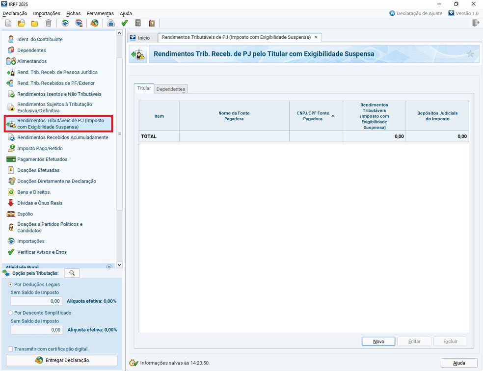 Mas,se você tiver algum questionamento sobre isso em processo,clique em “Novo”. Devem ser incluídos o CPF ou CNPJ e o nome da fonte pagadora,o valor dos rendimentos tributáveis com exigibilidade suspensa e os depósitos judiciais de imposto.