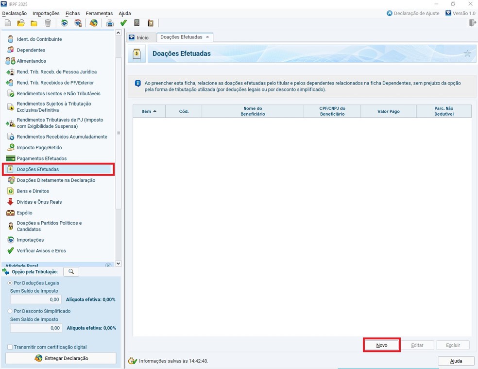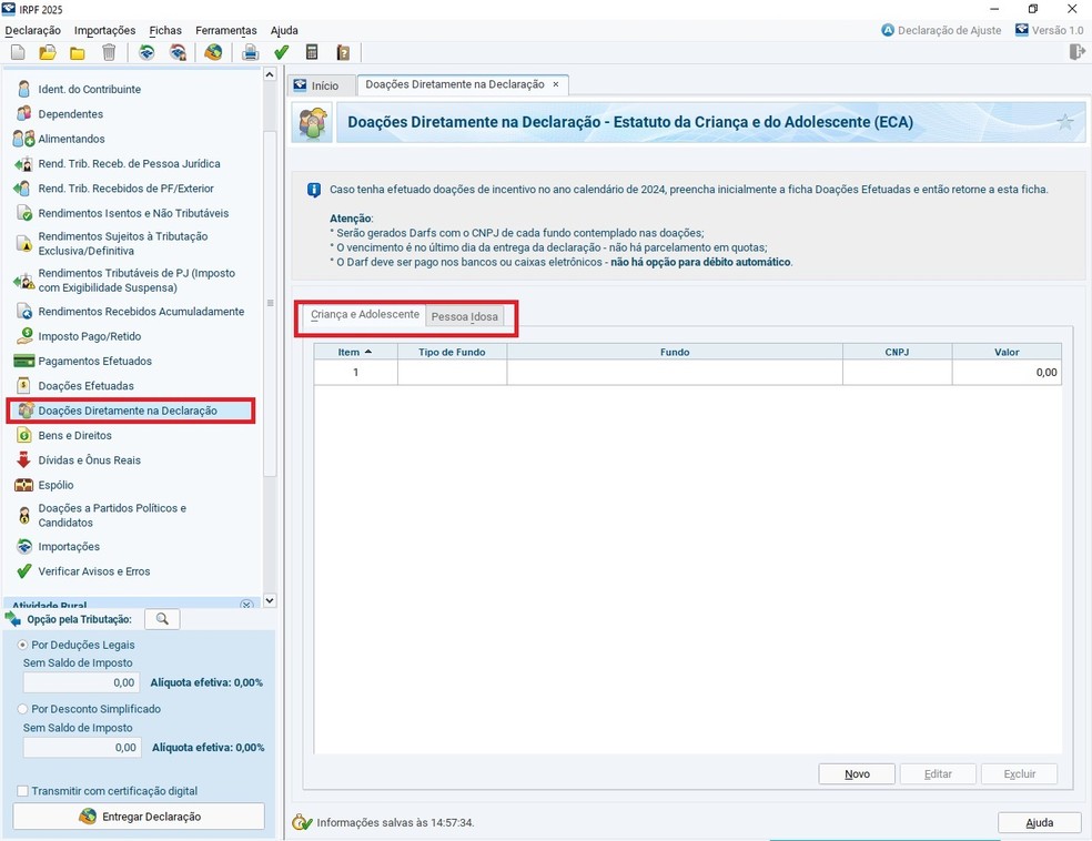 Para quem realizou doações no ano passado,é possível adicionar os valores na aba "Doações Efetuadas". Dentro da ficha,o programa apresenta as diversas opções que podem ser utilizadas para dedução de impostos,como incentivos à cultura,esportiva,ao incentivo audiovisual,ao ECA e ao Projeto Nacional de Apoio à Atenção Oncológica (Pronon).