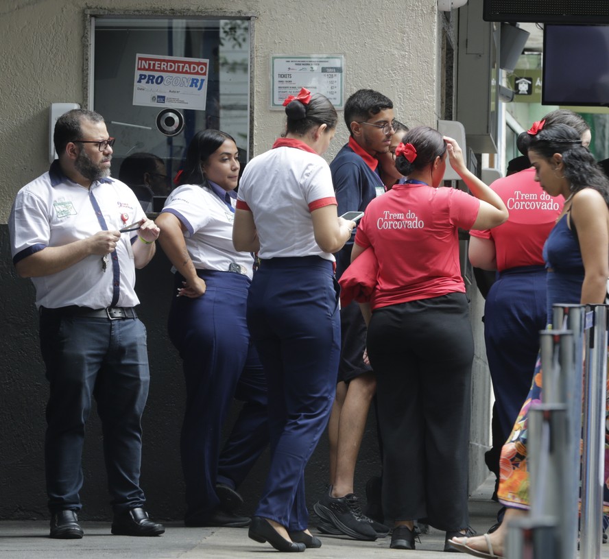Funcionários da concessionária Trem do Corcovado diante da bilheteria interditada nesta segunda-feira — Foto: Alexandre Cassiano / Agência O Globo