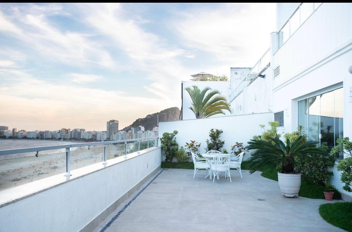 O primeiro piso oferece um hall privativo que dá acesso a um amplo living com vista para o mar,sala de jantar,escritório,três suítes espaçosas,copa,cozinha e área para funcionários. O segundo andar é dedicado ao lazer,com uma sala de TV com home theater,duas suítes,um escritório,uma cozinha de apoio e uma varanda com vista panorâmica para a praia. No terceiro andar,a área de lazer tem piscina aquecida,hidromassagem,sauna,espaço gourmet com forno de pizza e churrasqueira,tudo com a vista do mar de Copacabana como cenário.