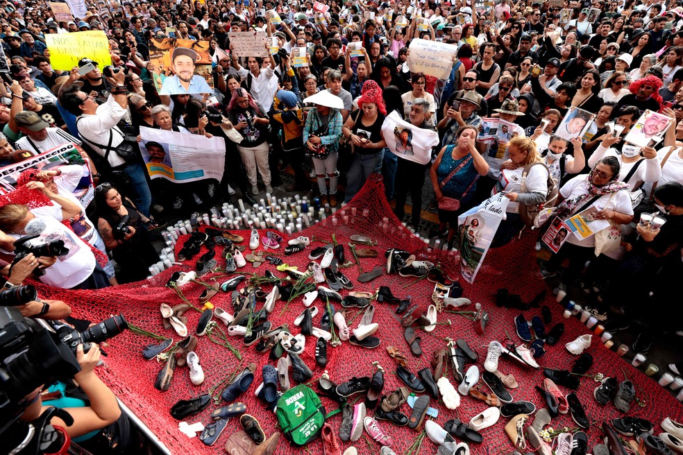 Manifestantes posicionaram sapatos dentro dos retângulos,simbolizando os pertences encontrados no local — Foto: Ulises Ruiz / AFP