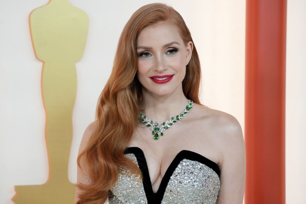 Jessica Chastain e o colar de esmeraldas no Oscar — Foto: Getty Images