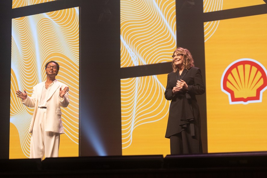 Os apresentadores Clayton Nascimento e Renata Sorrah,no palco do Teatro Riachuelo — Foto: Divulgação Shell/Alessandro Costa