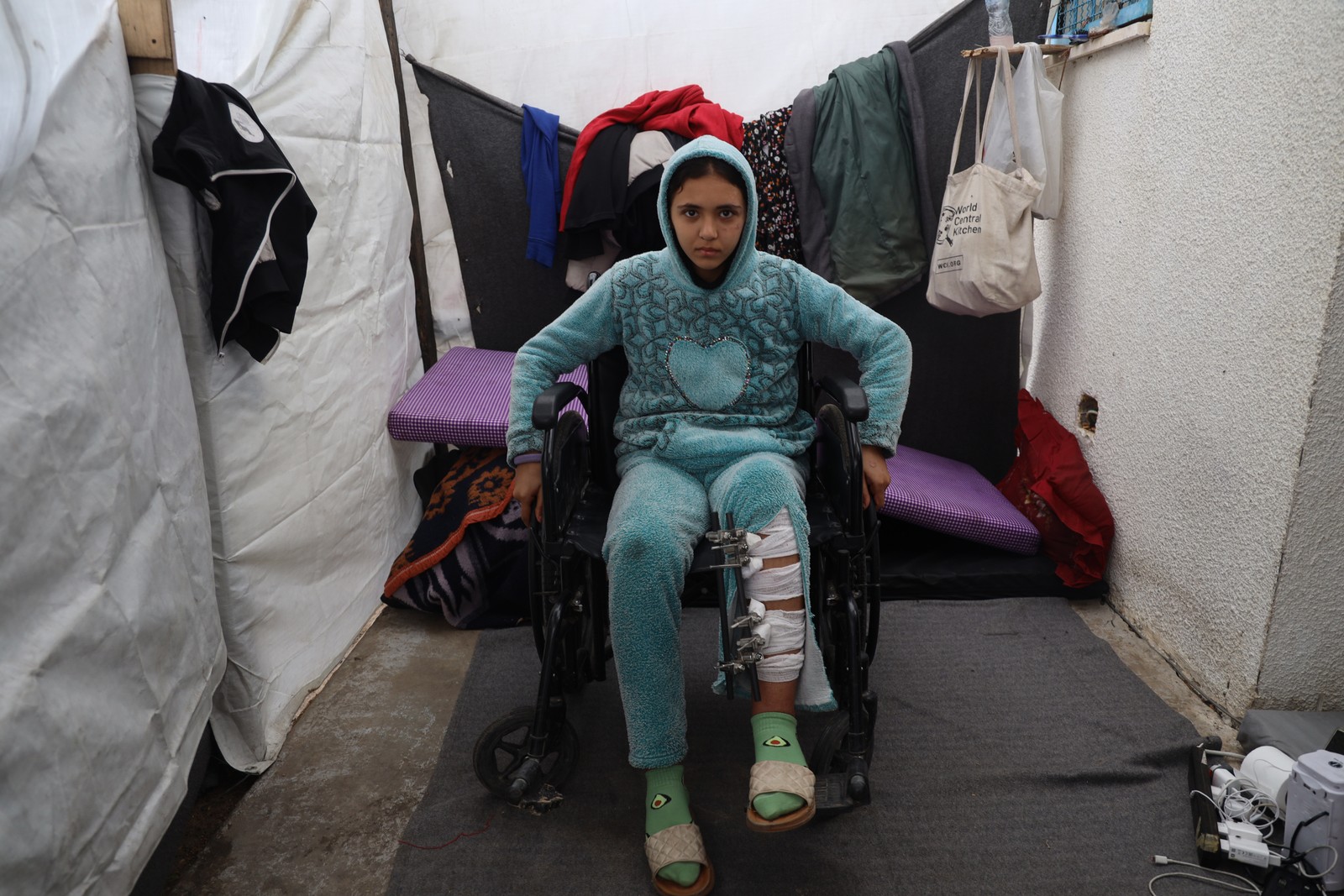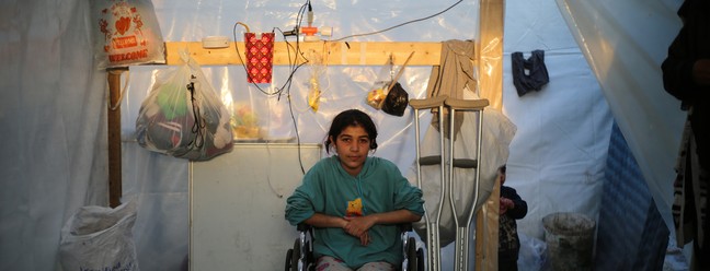 Mays,de 13 anos,sentada numa cadeira de rodas devido a uma lesão na perna,em Khan Yunis,sul de Gaza. — Foto: © UNICEF/UNI501951/El Baba