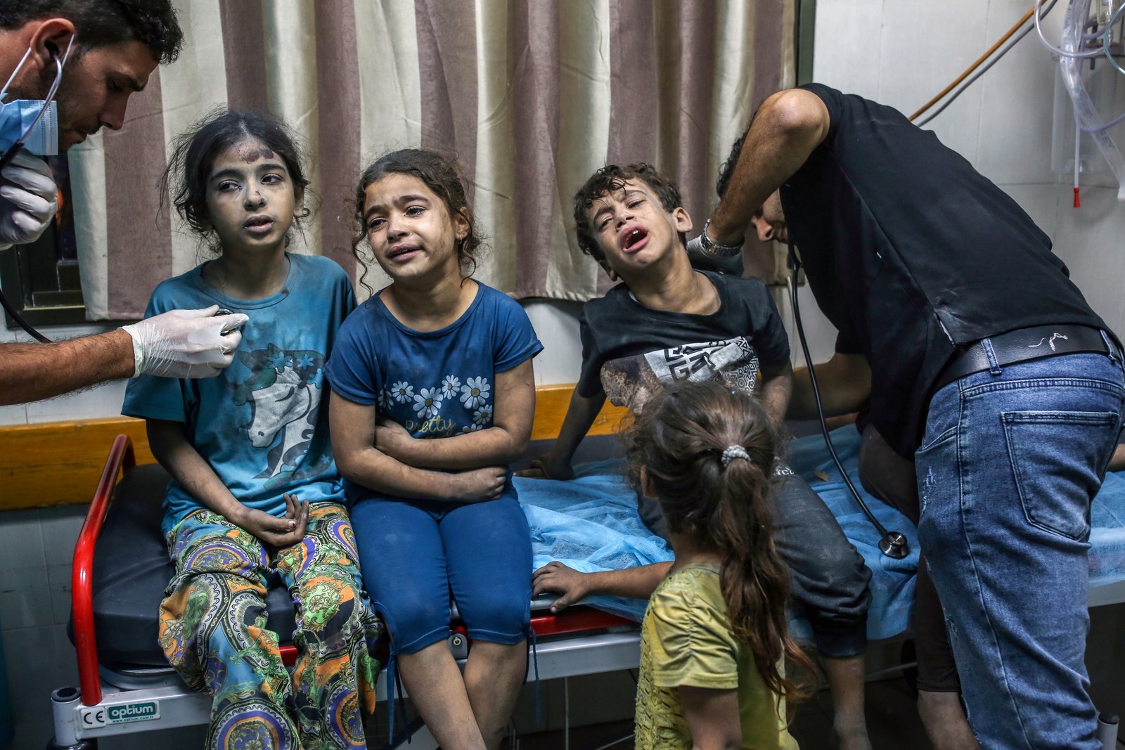 Crianças feridas por um ataque aéreo israelense são tratadas num hospital em Khan Younis,no sul de Gaza — Foto: Samar Abu Elouf/The New York Times