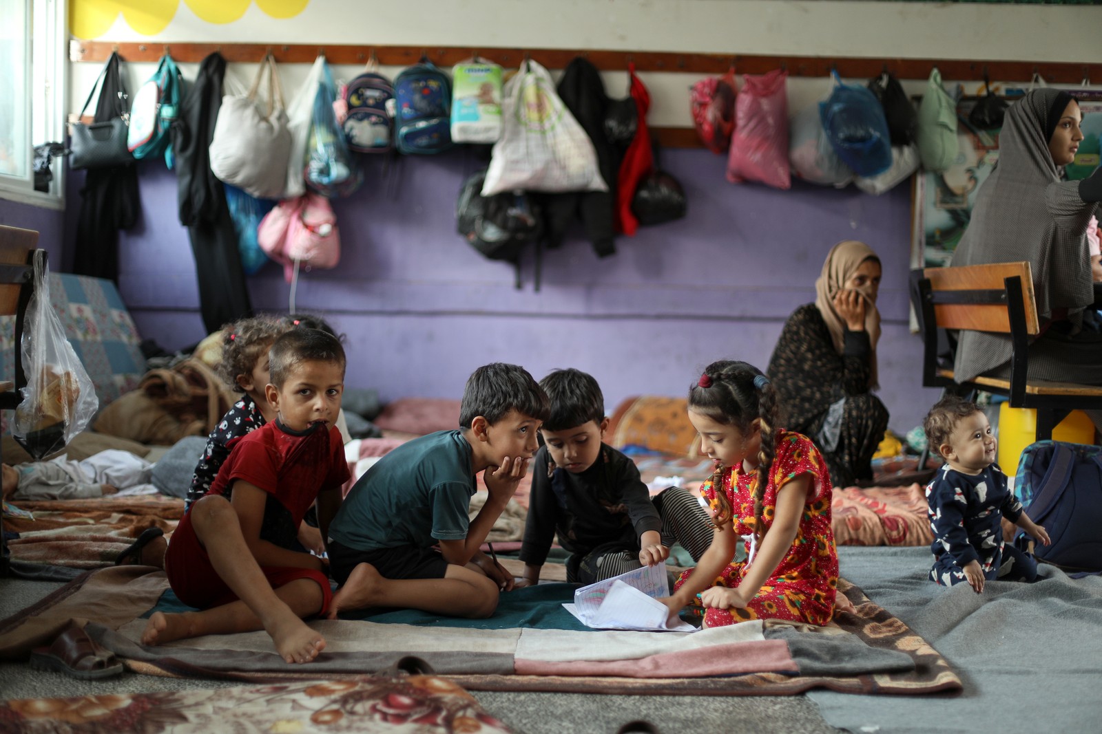 Crianças palestinas em uma escola administrada pelas Nações Unidas em Khan Younes,no sul da Faixa de Gaza,agora repleta de refugiados da Cidade de Gaza.