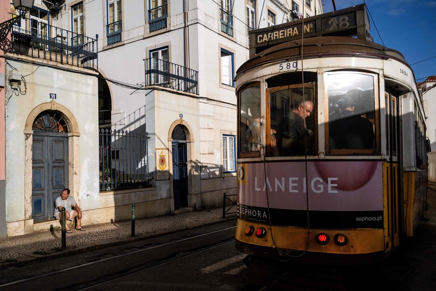 Bonde passa diante de homem sentado em uma calçada de Lisboa — Foto: Patrícia de Melo Moreira/AFP