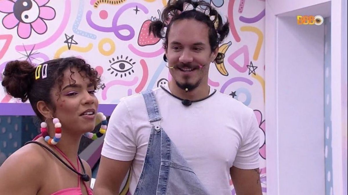 Matteus e Deniziane formaram o primeiro casal do 'BBB' 23. Os dois se aproximaram desde o primeiro dia e protagonizaram um romance fofo. Mas antes de ser eliminada,a sister terminou o affair,afirmando que não queria se perder no jogo — Foto: Reprodução/Globo