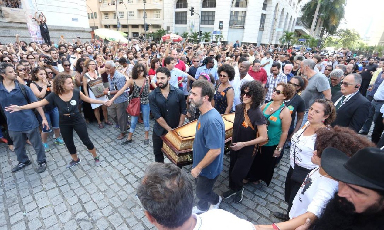 A chegada dos caixões de Marielle e Anderson à Câmara de Vereadores do Rio no velório que marcou o início de inúmeras manifestações populares que passaram a ocorrer no Rio e no mundo por conta da morte da parlamentar — Foto: Guilherme Pinto / Agência O Globo