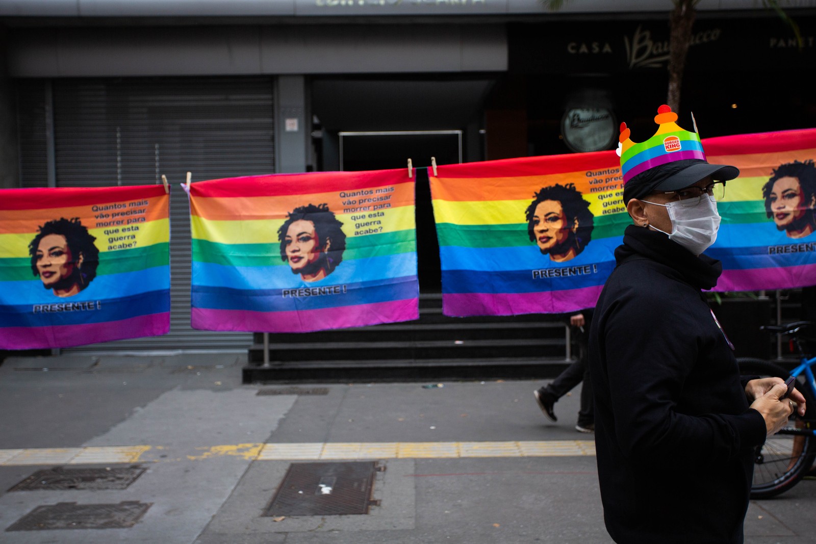 Evento tem bandeiras com a inscrição "Fora,Bolsonaro" e com o rosto da ex-vereadora Marielle Franco,assassinada em 2018 no Rio de Janeiro — Foto: Maria Isabel Oliveira / Agência O Globo