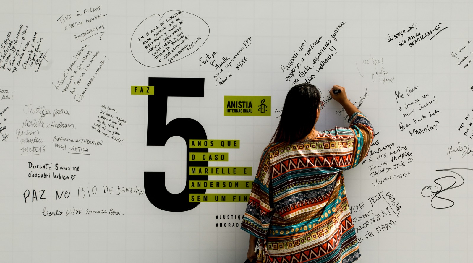 Manifestante posa em frente a cartaz para cobrar uma resposta da Justiça — Foto: Roberto Moreyra/Agência O Globo