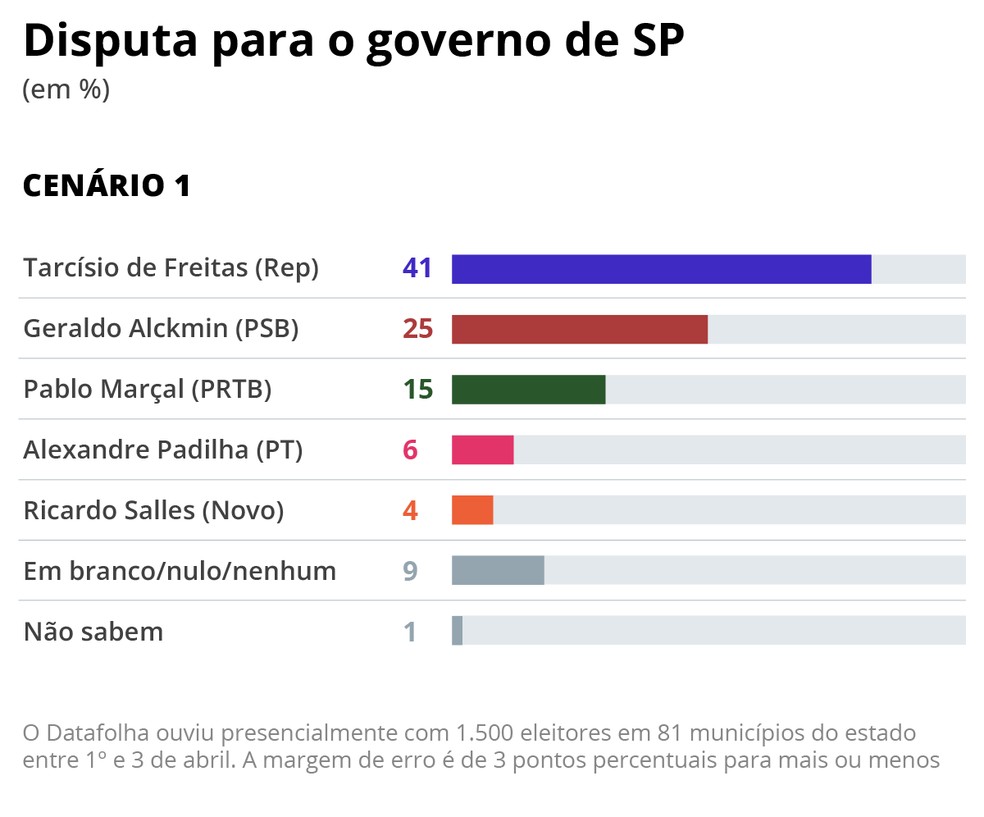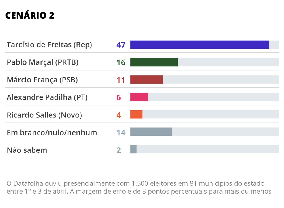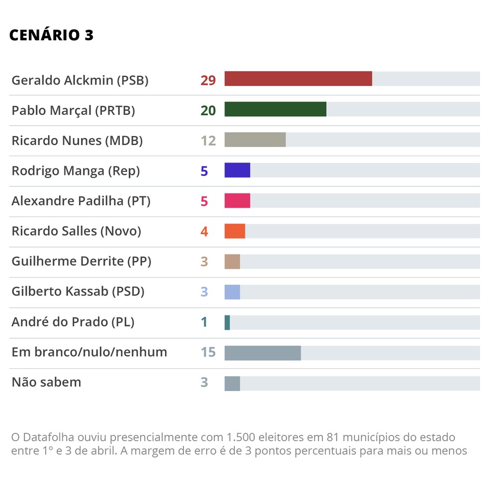 Caso Tarcísio não participe da disputa paulista,a liderança da corrida eleitoral seria assumida por Alckmin,com 29% das intenções de voto,seguido por Marçal,com 20%. O prefeito Ricardo Nunes (MDB),que recentemente passou a se colocar à disposição de Tarcísio para substituí-lo na eleição,hoje aparece com 12% das menções. O prefeito de Sorocaba,Rodrigo Manga (Republicanos),é o favorito de 5% dos eleitores,mesma taxa dos que optam por Padilha nesse cenário.