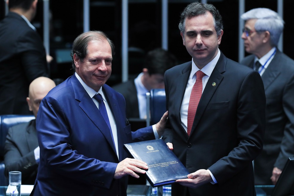 Luis Felipe Salomão e Rodrigo Pacheco com a proposta de reforma do Código Civil — Foto: Lula Marques/ Agência Brasil