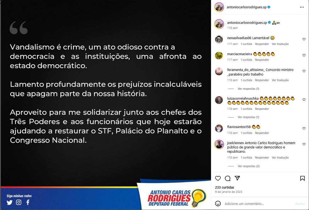 Postagem feita nas redes sociais do Deputado Federal Antônio Carlos Rodrigues — Foto: Instagram / Divulgação