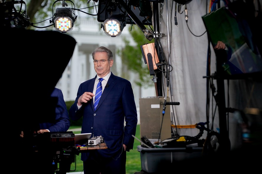 Scott Bessent,secretário do Tesouro dos EUA,em uma entrevista para a televisão do lado de fora da Casa Branca depois do anúncio de Trump sobre tarifas recíprocas — Foto: Kent Nishimura/Bloomberg
