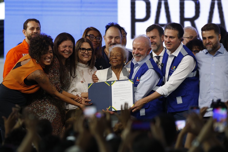 Lula e outras autoridades durante o evento desta segunda-feira — Foto: Alexandre Cassiano
