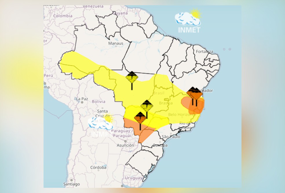 Um alerta na escala laranja,de "perigo",indica tempestades no Mato Grosso do Sul e em Goiás,próximo à fronteira com o Paraguai. O aviso representa precipitações de até 100 mm/dia,ventos intensos entre 60 e 100 km/h,além da possibilidade de corte de energia elétrica e estragos em plantações.