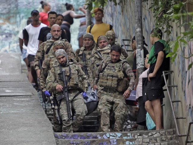 Policiais descem com corpo durante operação na Ladeira dos Tabajaras mira assassinos de policial marido de juíza — Foto: Fabiano Rocha / Agência O Globo