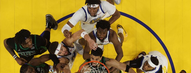 Jayson Tatum,Jaylen Brown e Robert Williams,do Boston Celtics,competem pelo rebote contra Klay Thompson,Kevon Looney,Andrew Wiggins e Gary Payton,do Golden State Warriors,durante o terceiro quarto do jogo cinco das finais da NBA de 2022,no Chase Center,em 13 de junho,em San Francisco,Califórnia. — Foto: Ezra Shaw/Getty Images/AFP