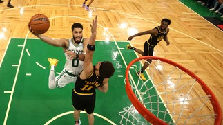 Jayson Tatum,se dirige para a cesta contra Klay Thompson,do Golden State Warriors — Foto: EZRA SHAW / AFP