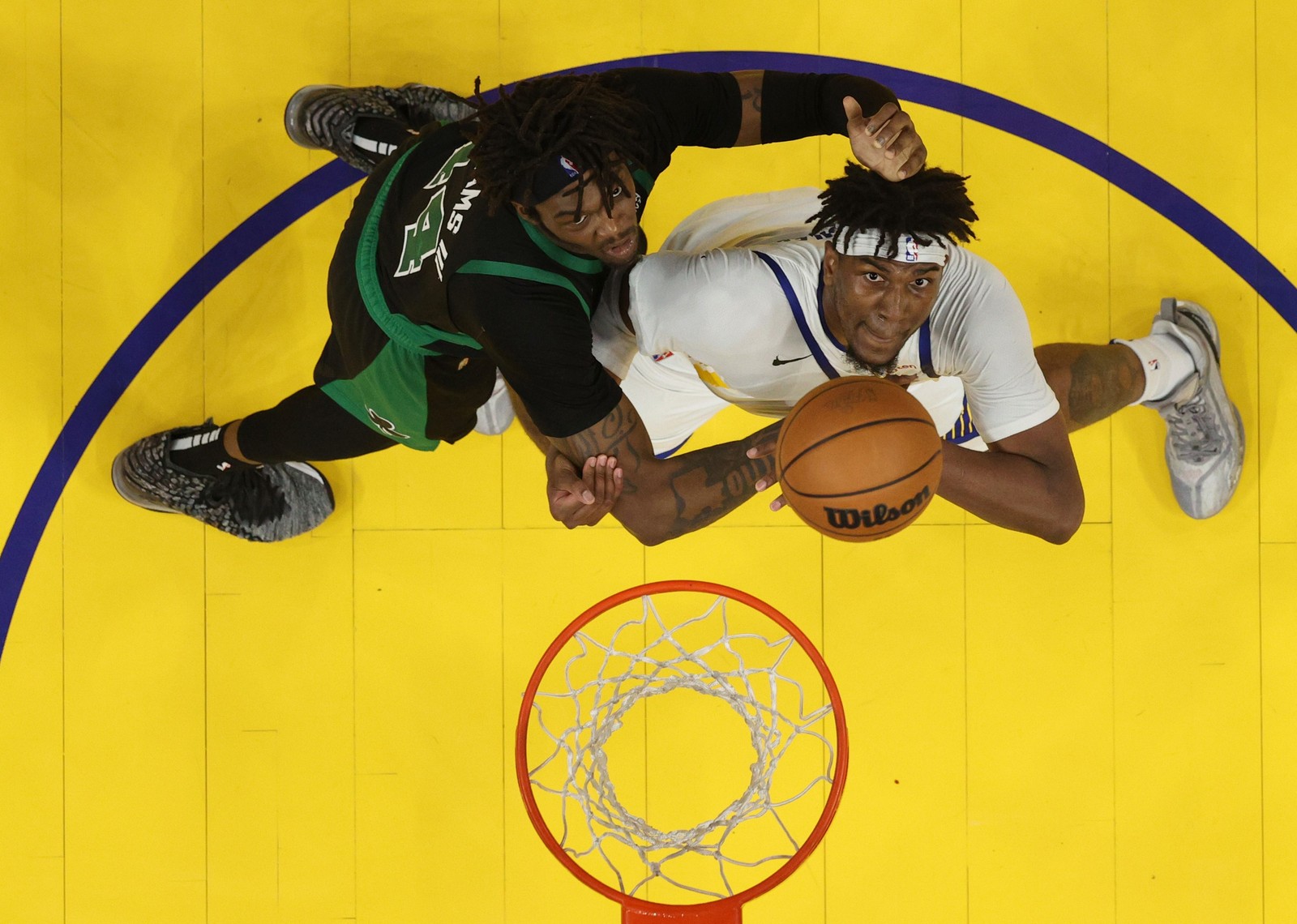 Kevon Looney,e Robert Williams,competem pelo rebote. — Foto: Ezra Shaw/Getty Images/AFP