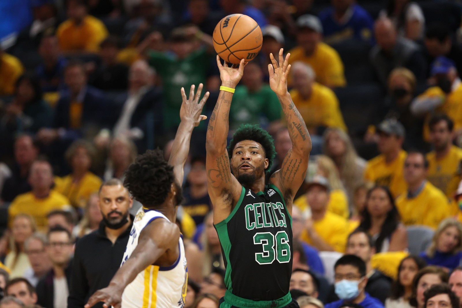 Marcus Smart,lança contra Andrew Wiggins,durante terceiro quarto do jogo cinco das finais da NBA. — Foto: Ezra Shaw/Getty Images/AFP