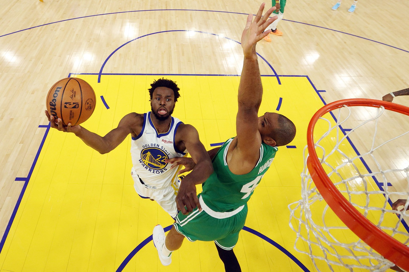 Andrew Wiggins,e Al Horford,durante o primeiro tempo do primeiro jogo das finais da NBA de 2022,2 de junho,em São Francisco,Califórnia. — Foto: Ezra Shaw/Getty Images/AFP