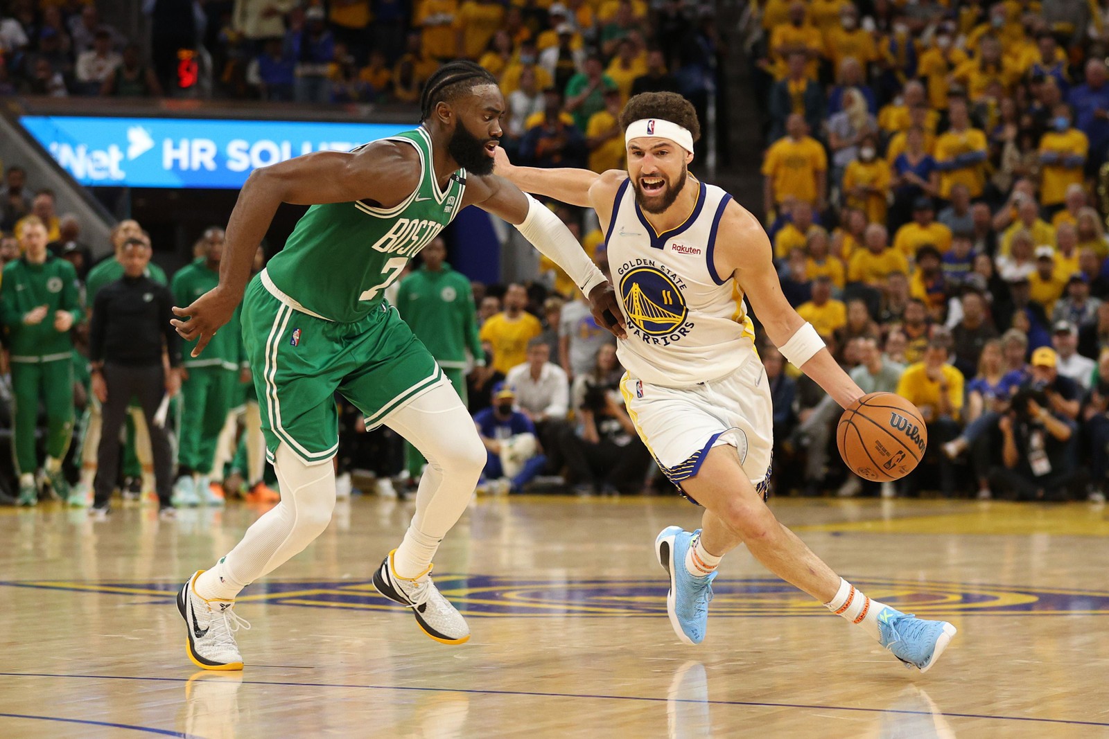 Klay Thompson,dribla Jaylen Brown,do Boston Celtics — Foto: Ezra Shaw/Getty Images/AFP