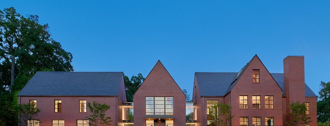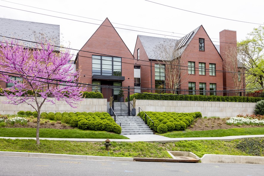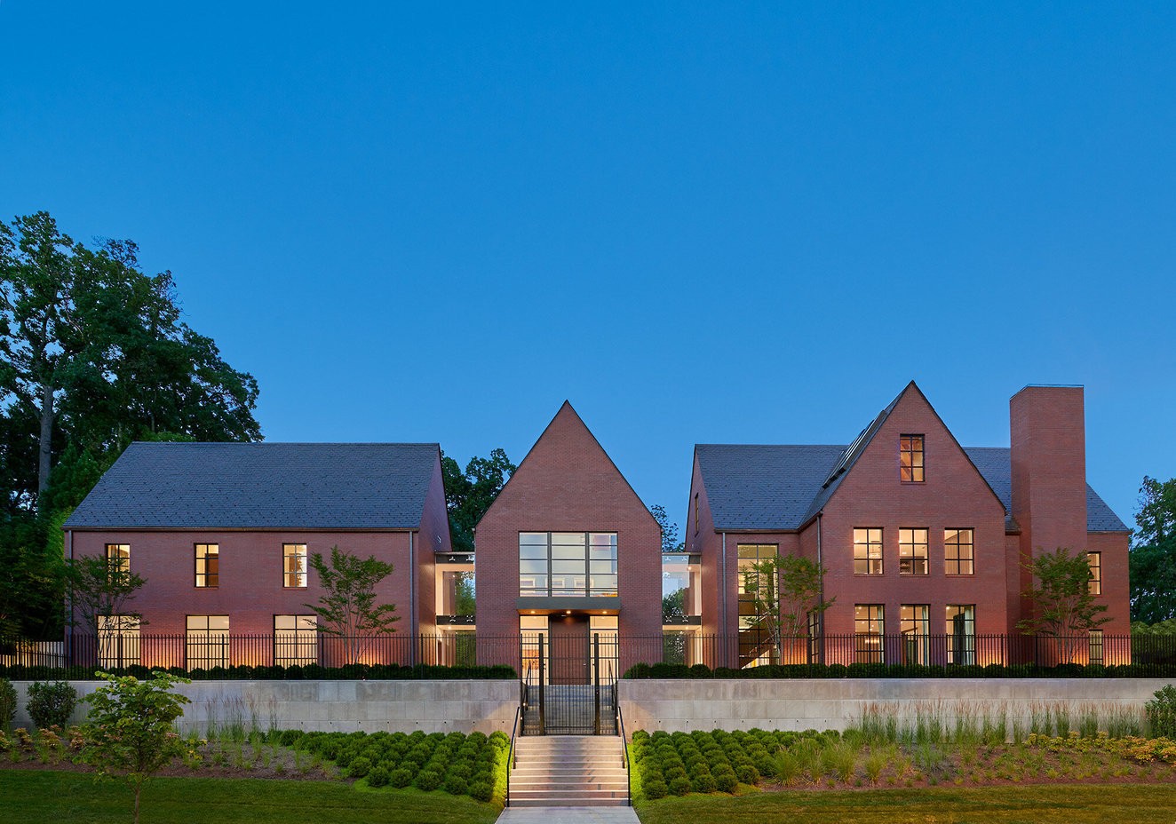 Projetada pelo arquiteto Robert Gurney,a casa tem um estilo contemporâneo,mas elementos tradicionais,como fachada de tijolos vermelhos e telhado inclinado.