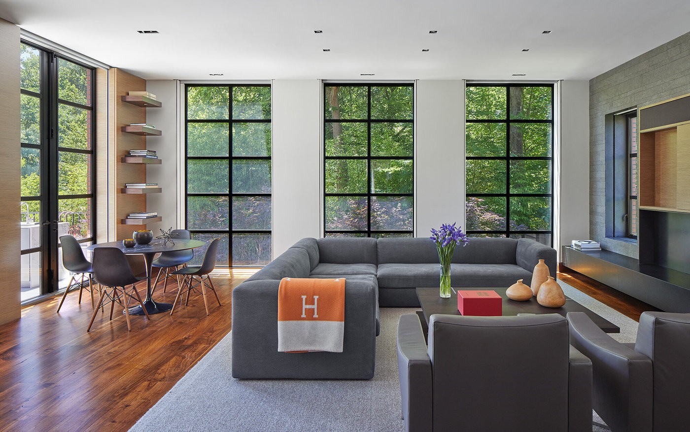 Os donos originais — um casal com filhos que organizava eventos beneficentes — queriam uma casa moderna. Gurney deu um toque especial com os corredores envidraçados unindo os três blocos da casa.