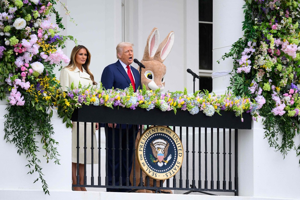 Ao lado de Melania e de homem vestido de coelho,Trump fala sobre legado do Papa,antes de dar início à Caça aos Ovos de Páscoa na Casa Branca — Foto: Mandel Ngan / AFP