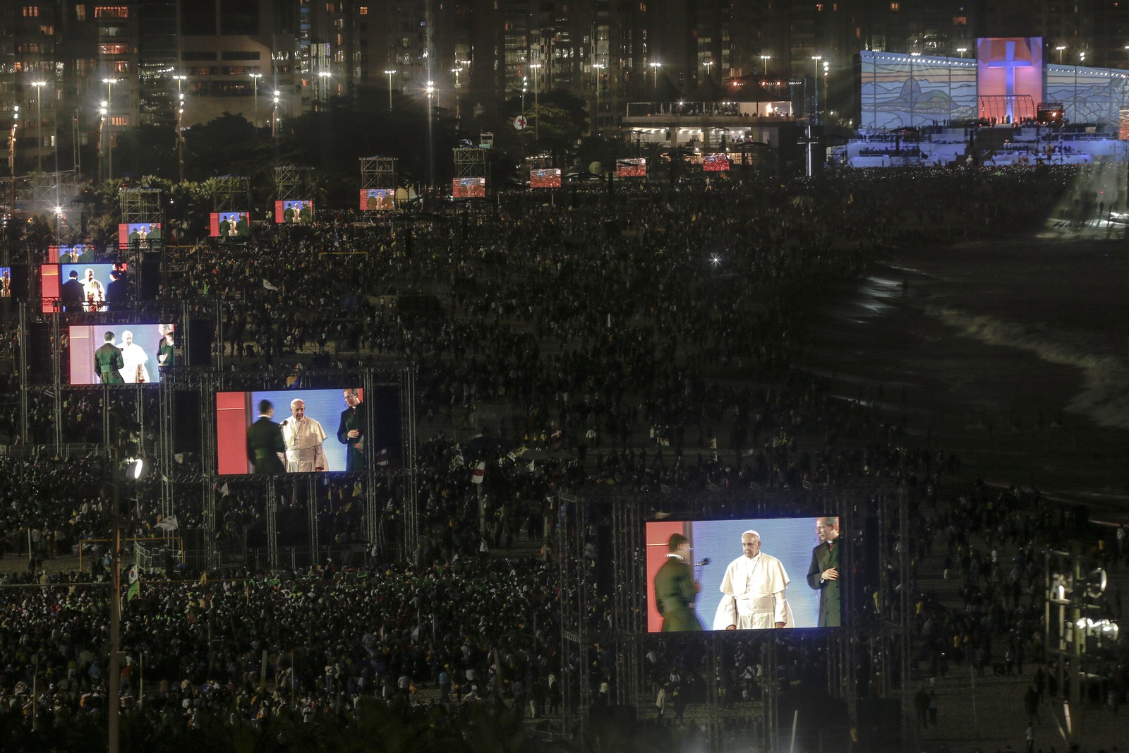 Peregrinos lotam a praia de Copacabana para assisir à Via Sacra e o discurso do Papa Francisco — Foto: Paula Giolito / agencia O Globo