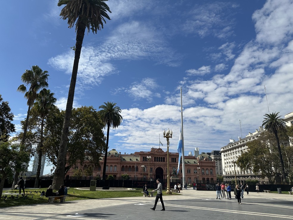 Praça de Maio com a bandeira argentina a meio mastro — Foto: Janaína Figueiredo