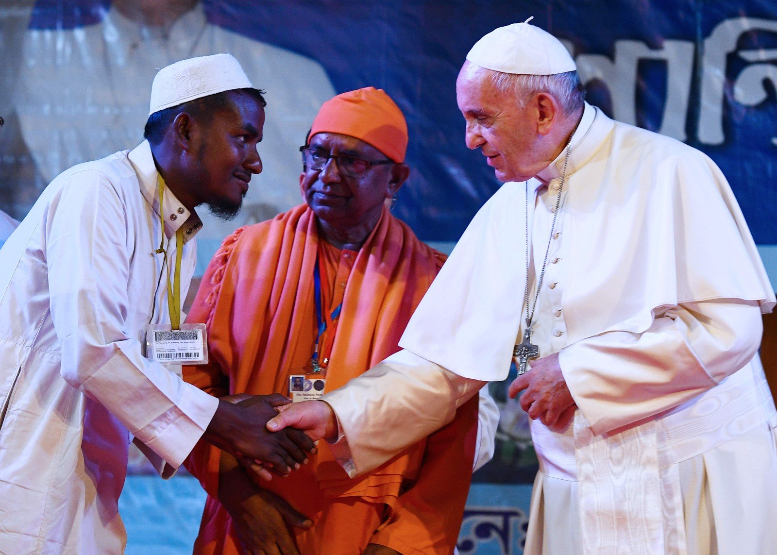 Papa Francisco cumprimenta refugiado rohingya durante uma reunião inter-religiosa em Dhaka,Bangladesh,em 1º de dezembro de 2017 — Foto: AFP PHOTO / Vincenzo PINTO