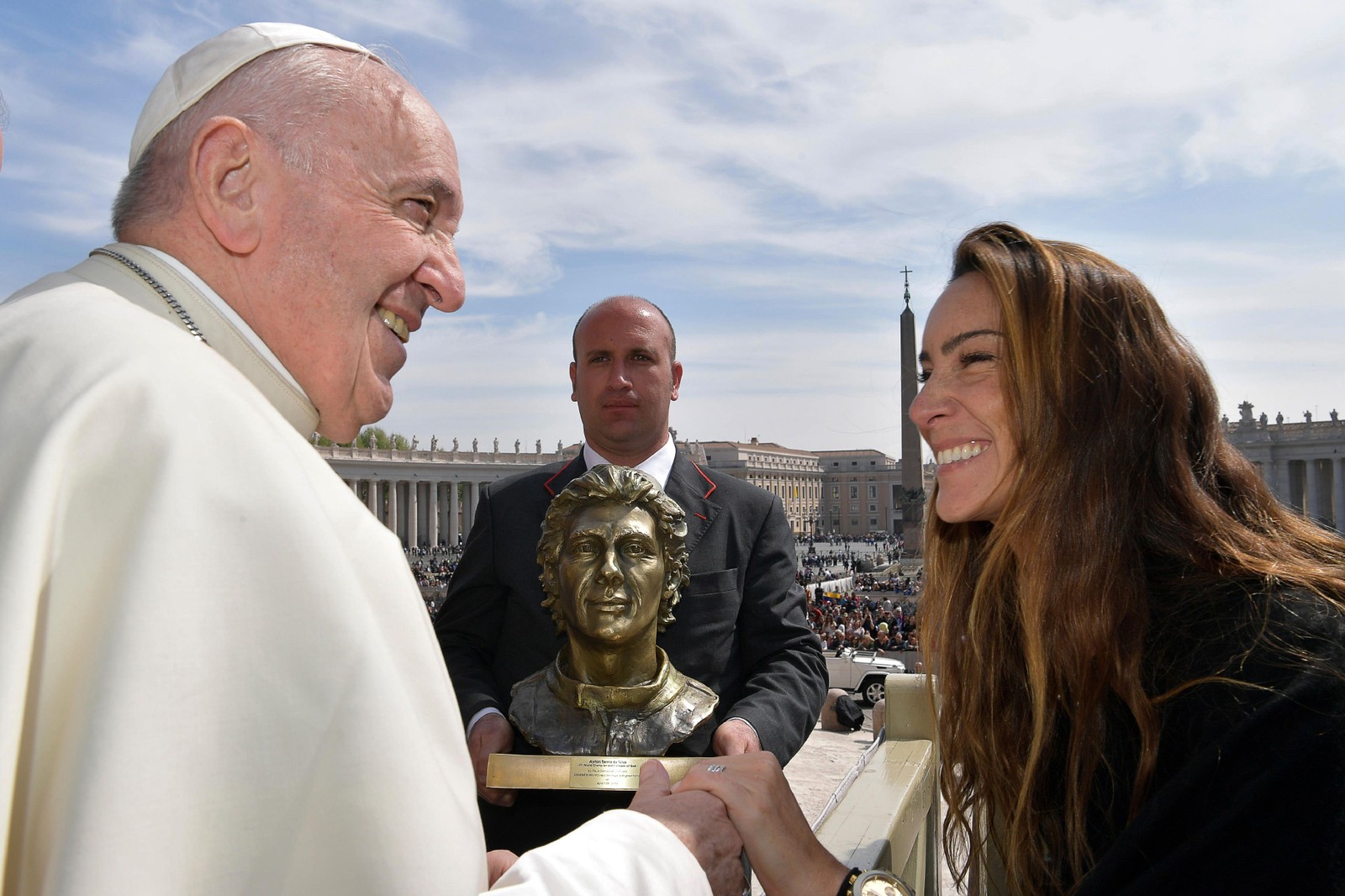 Papa Francisco recebe busto de bronze de Ayrton Senna,presente do sobrinha do piloto,Paula Senna Lalli,ao final da audiência geral no Vaticano,em 17 de abril de 2019 — Foto: VATICAN MEDIA / AFP
