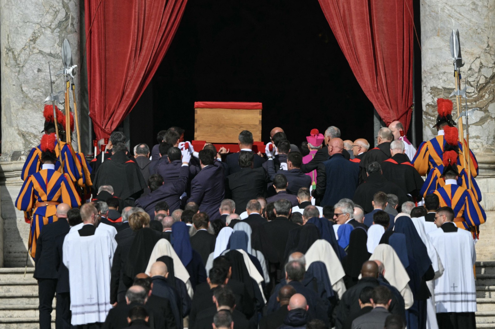 Carregadores,ao lado de Guardas Suíços,carregam o caixão do Papa Francisco — Foto: AFP
