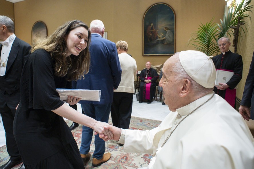 A economista Mariana Rêis Maria,professora na Universidade Estadual de Campinas e membro da instituição The Economy of Francesco (EoF),em encontro com o Papa Francisco — Foto: Arquivo pessoal