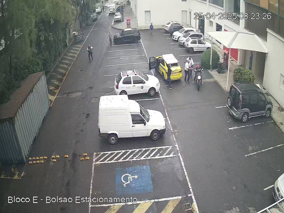 3h30 às 8h23 - A seguir,Mendes foi ao escritório de arquitetura,no shopping center,onde ele tentou levar vários quadros,mas,de acordo com a Polícia Civil,não conseguiu finalizar o crime. Nas câmeras de segurança é possível vê-lo descendo o elevador com os quadros. Ao sair,retirou o uniforme e chamou um táxi. Como as obras não cabiam no veículo,foram amarradas no teto. Seguranças do shopping desconfiaram da movimentação e tentaram abordá-lo,mas Mendes montou em sua motocicleta,que estava sem placa,e fugiu.
