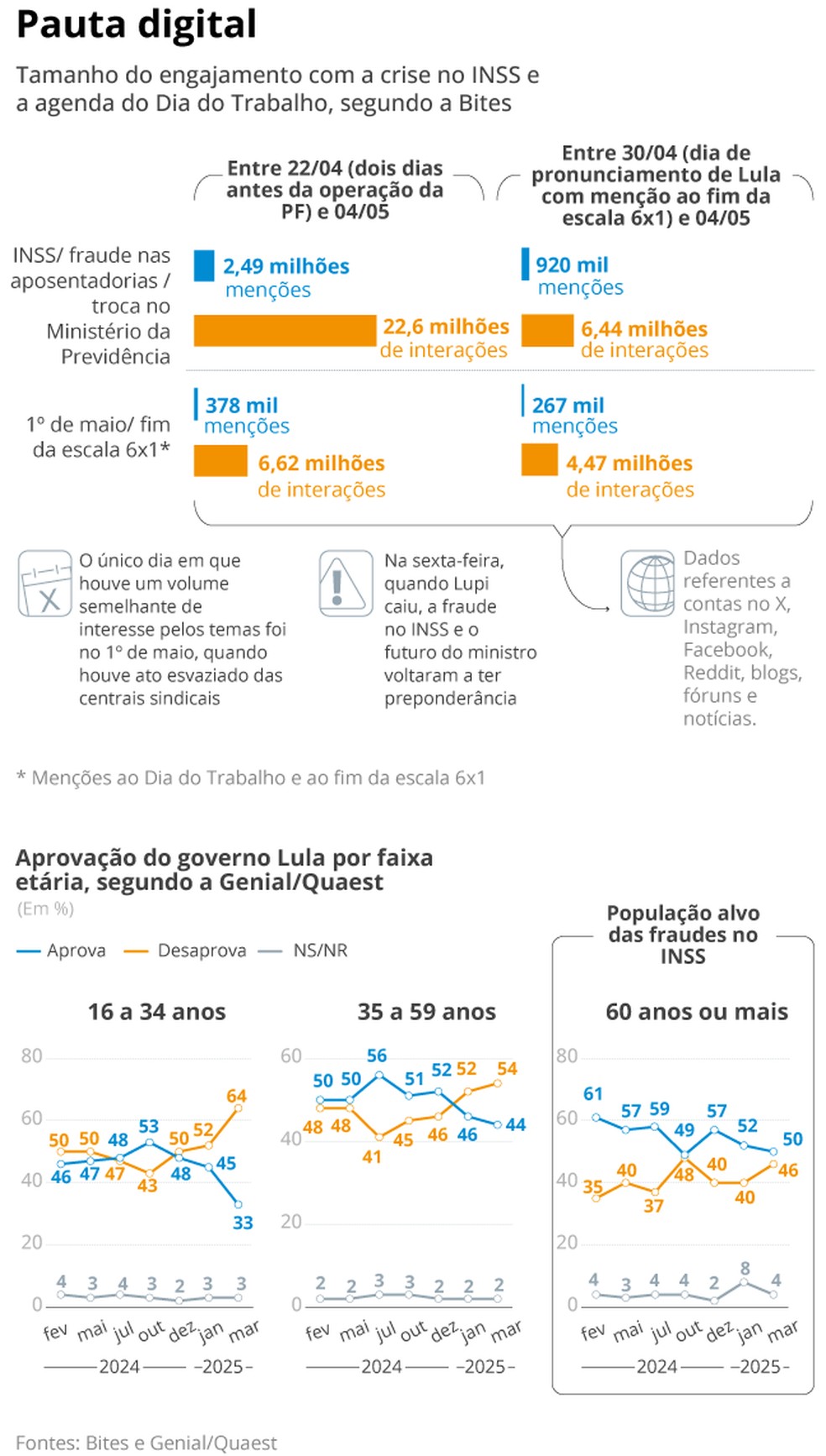 Se nas últimas duas semanas,foram contabilizadas 2,49 milhões de menções ao INSS,à fraude nas aposentadorias e à troca no ministério da Previdência,os temas ligados ao Dia do Trabalho e ao fim da escala 6x1,aposta de Lula em meio à queda de popularidade de sua gestão,somaram apenas 378 mil citações. Quando analisado o volume de curtidas,comentários e compartilhamentos,a distância se repete: a crise associada aos descontos indevidos gerou mais de 22,6 milhões de interações,contra 6,62 milhões da agenda trabalhista.