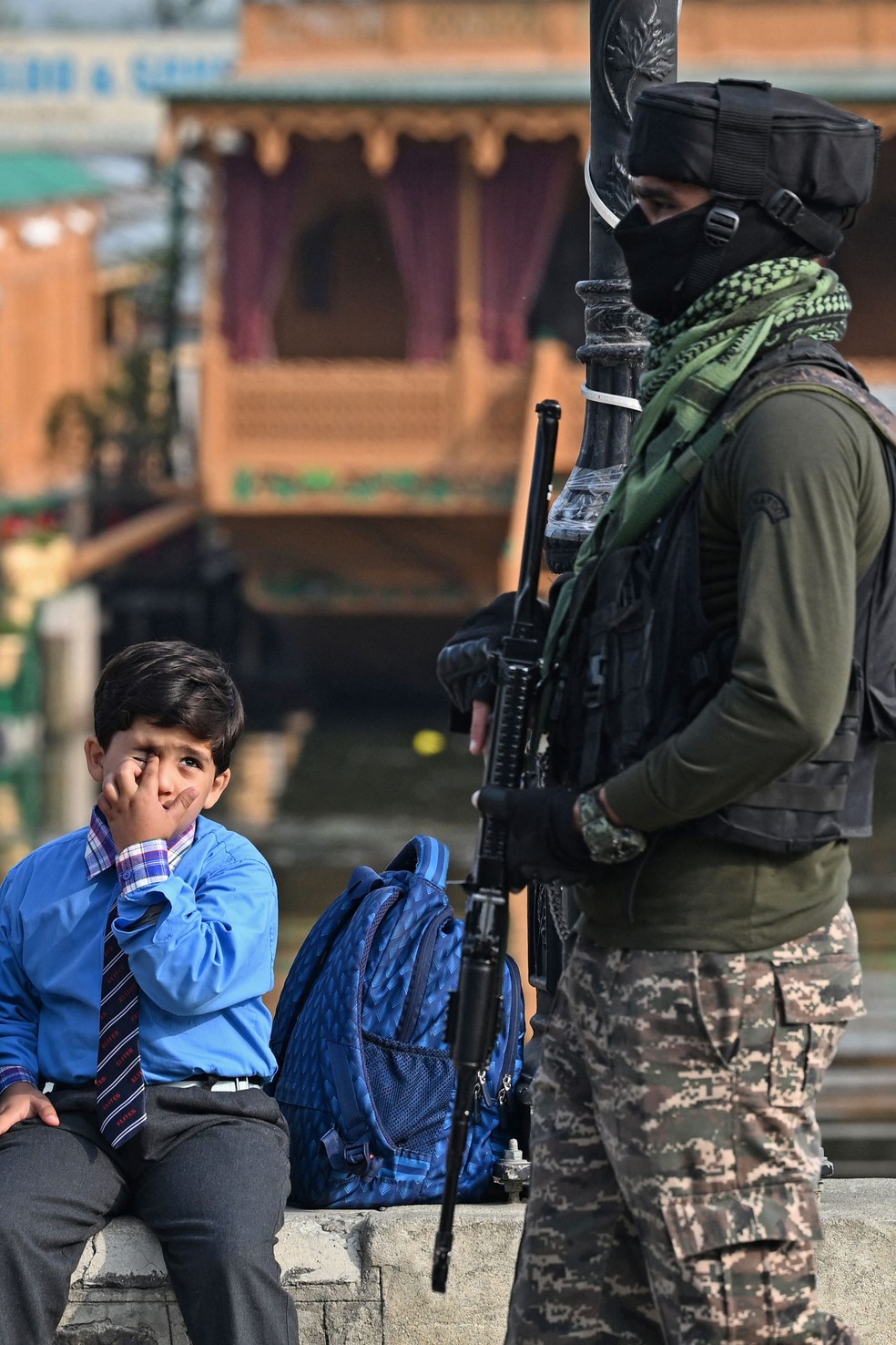 Criança senta-se às margens do Lago Dal enquanto um paramilitar indiano patrulha Srinagar — Foto: Sajjad HUSSAIN / AFP
