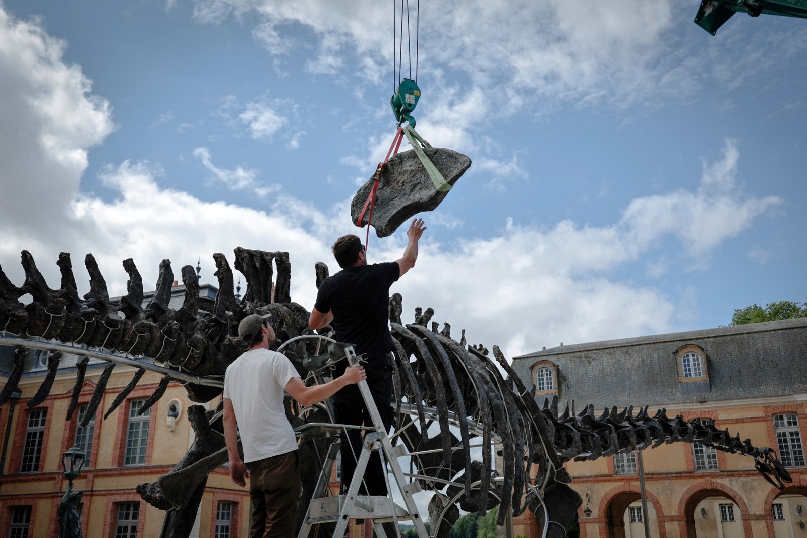 Herbívoro que tinha mais de 20 metros de comprimento e pesava cerca de 20 toneladas em vida — Foto: STEPHANE DE SAKUTIN/AFP