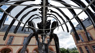 Dinossauro Apatosaurus chamado "Vulcain",está no castelo de Dampierre antes do leilão — Foto: STEPHANE DE SAKUTIN/AFP