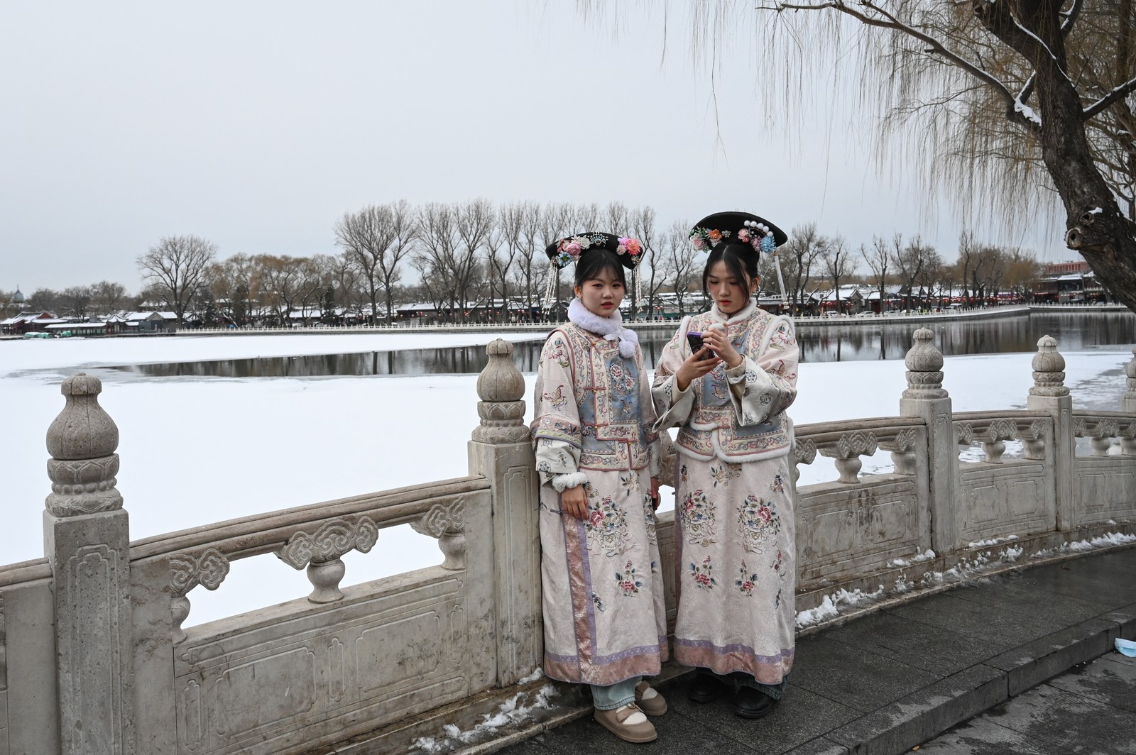 Pessoas visitam o Templo do Paraíso depois de nevasca em Pequim — Foto: WANG ZHAO/AFP