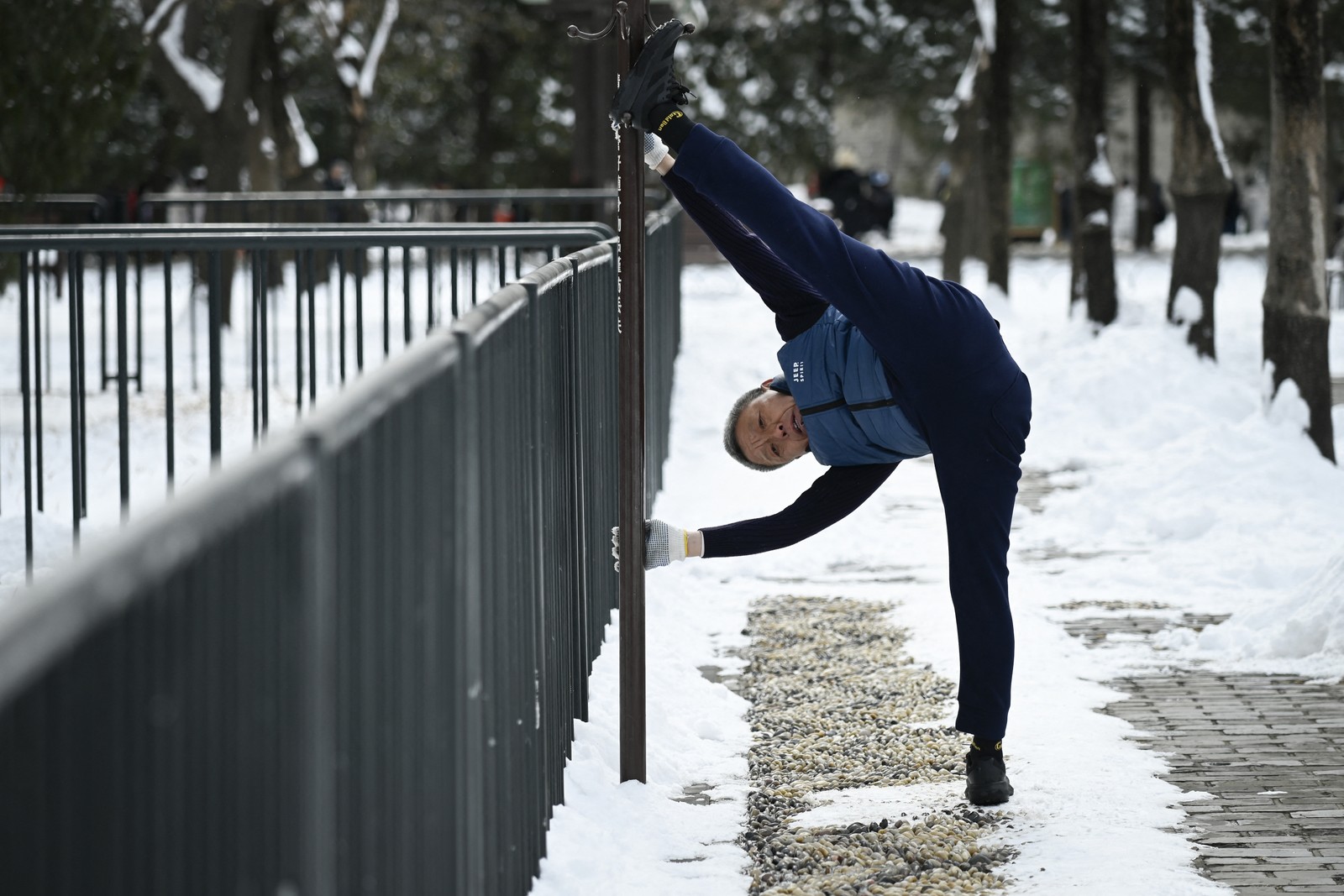 Um homem se exercita em um parque após uma nevasca em Pequim — Foto: WANG ZHAO/AFP